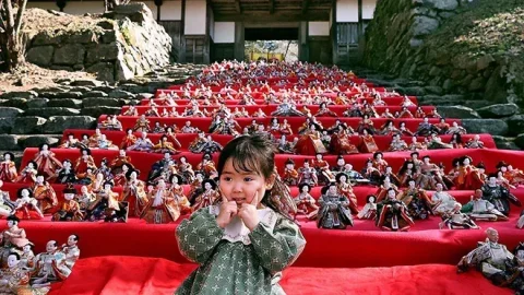 ญี่ปุ่นจัดแสดงตุ๊กตาฮินะ 600 ตัว บนบันไดหินของซากปราสาทอะกิซึกิ